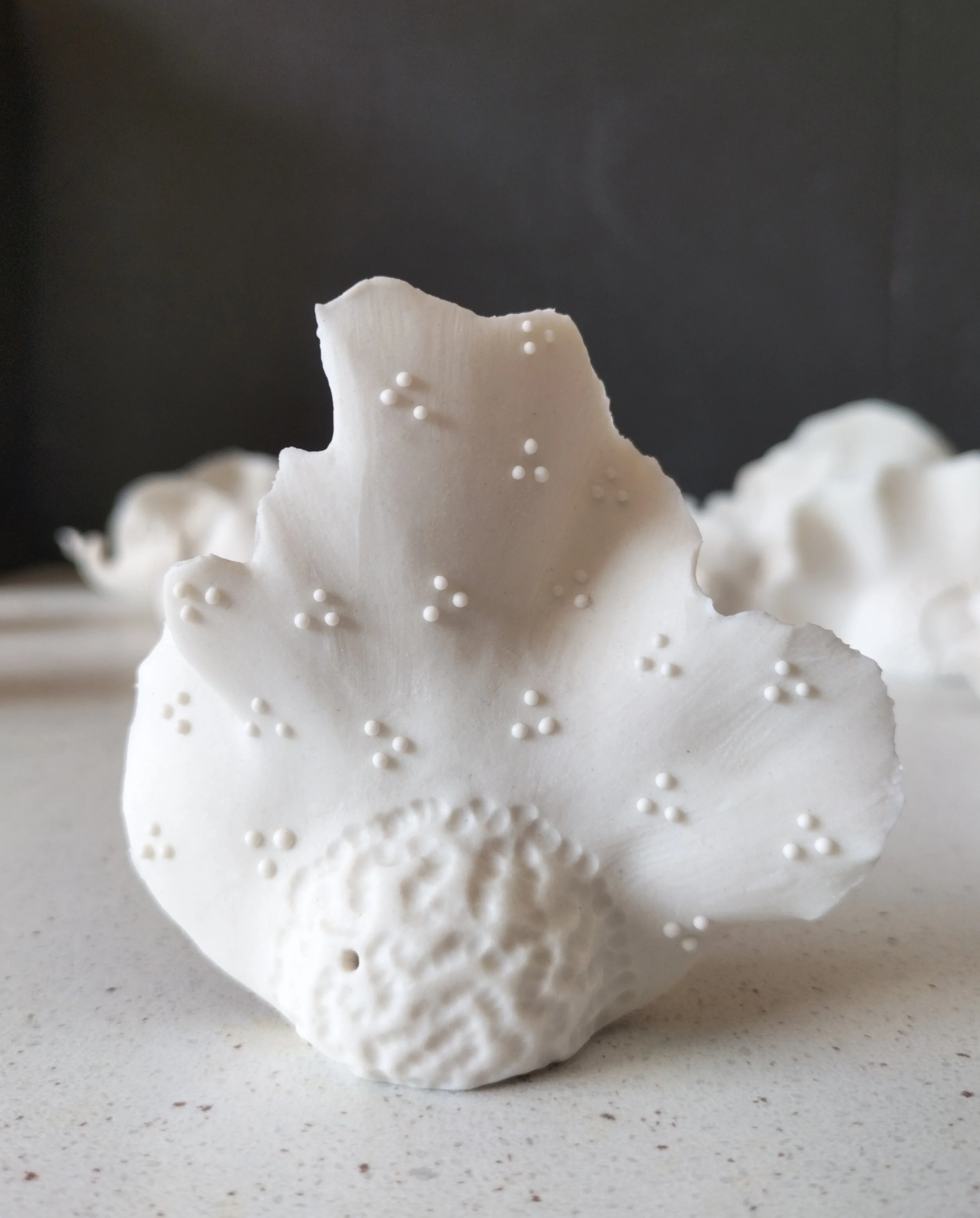 A fragment of bark, a stone, a shell, a patch of moss, a mushroom.